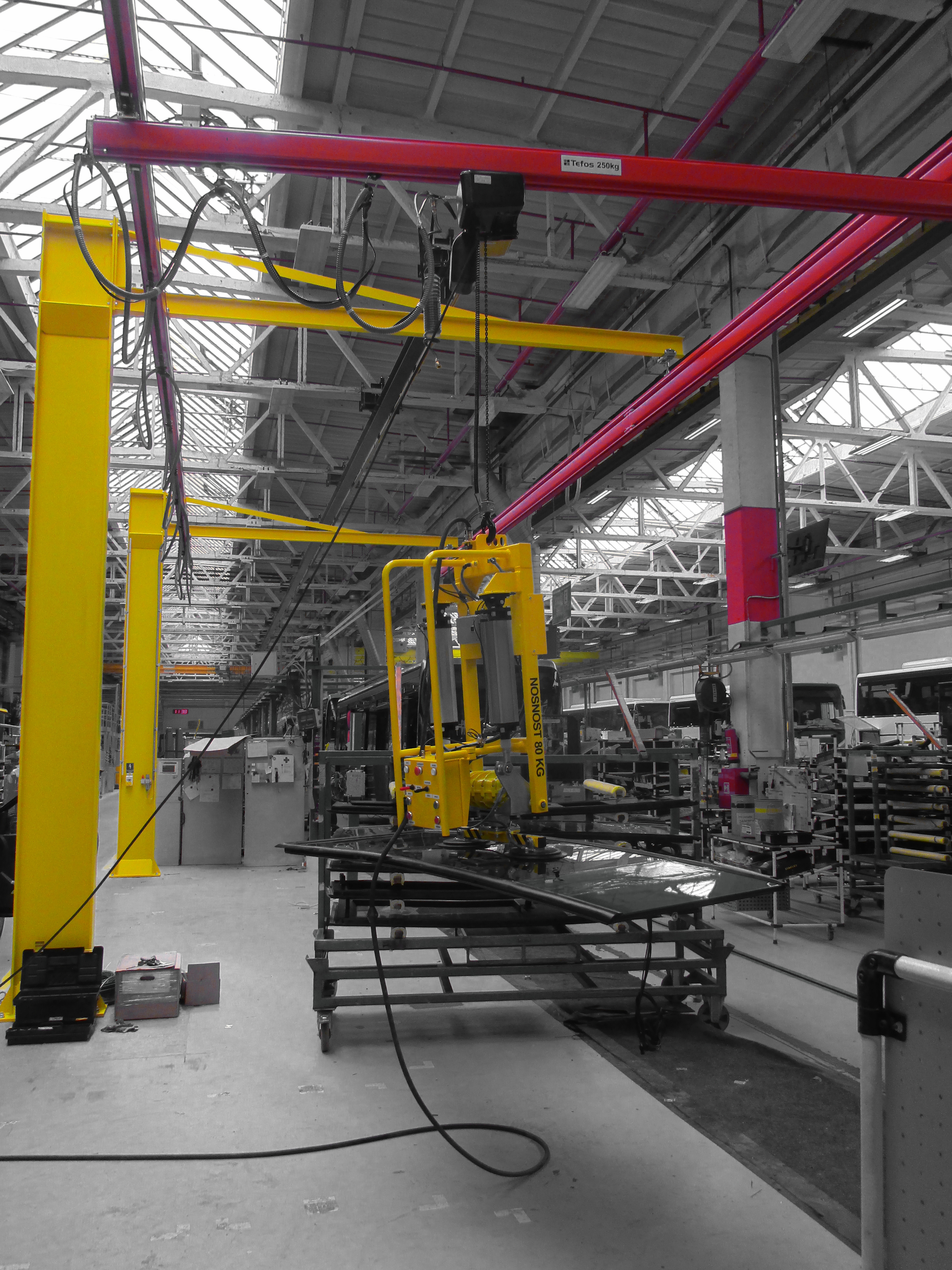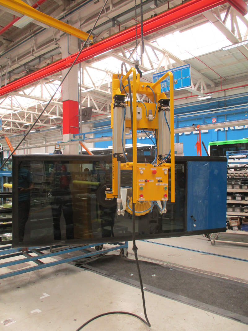 V této fázi výroby již bývá na autobusových dveřích provedena celá řada montážních kroků. Povrch je připravený, většinou lakovaný, osazený dalšími prvky případně ještě určený k finálnímu dokončení. Chapadlo využívá vakuové uchopení pomocí přísavek. Přítlačná síla se rozloží na určenou plochu a dveře drží pevně. Obsluha má kontrolu nad zdvihem i při jemném navádění k montážní pozici. Díky tomu pracovník pracuje klidněji, přesněji a rychleji.