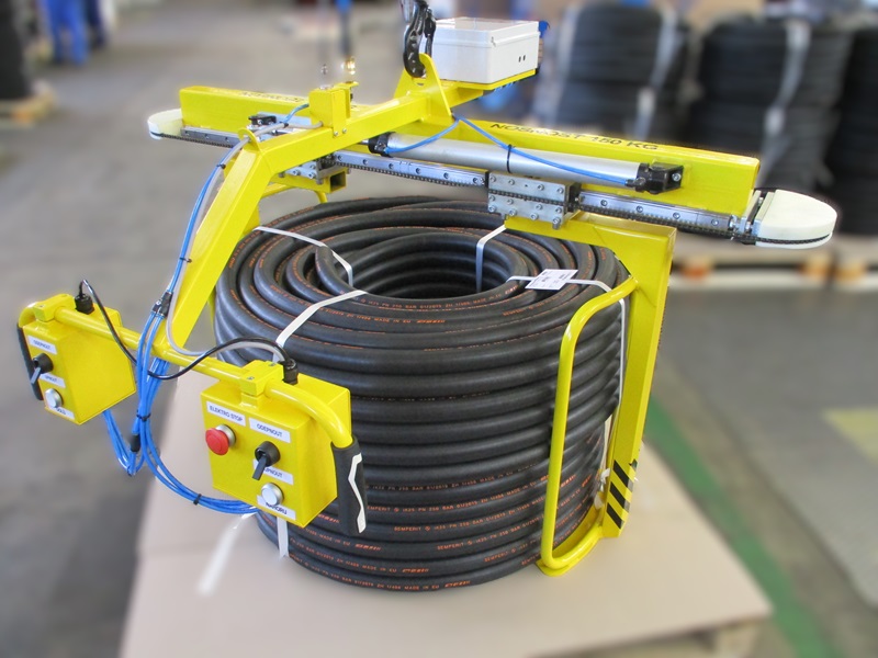 Řešením je samozřejmě využití specializovaného uchopovacího zařízení, které konstruujeme přímo na míru a podle typu břemene. Chapadlo svitku hadice CH 47 umožňuje stabilní uchopení svitku pomocí pneumaticky ovládaných čelistí. Celý proces manipulace je tak značně zprofesionalizován. Improvizované uchycování a manipulace se mění v postup, který lze snadno opakovat.