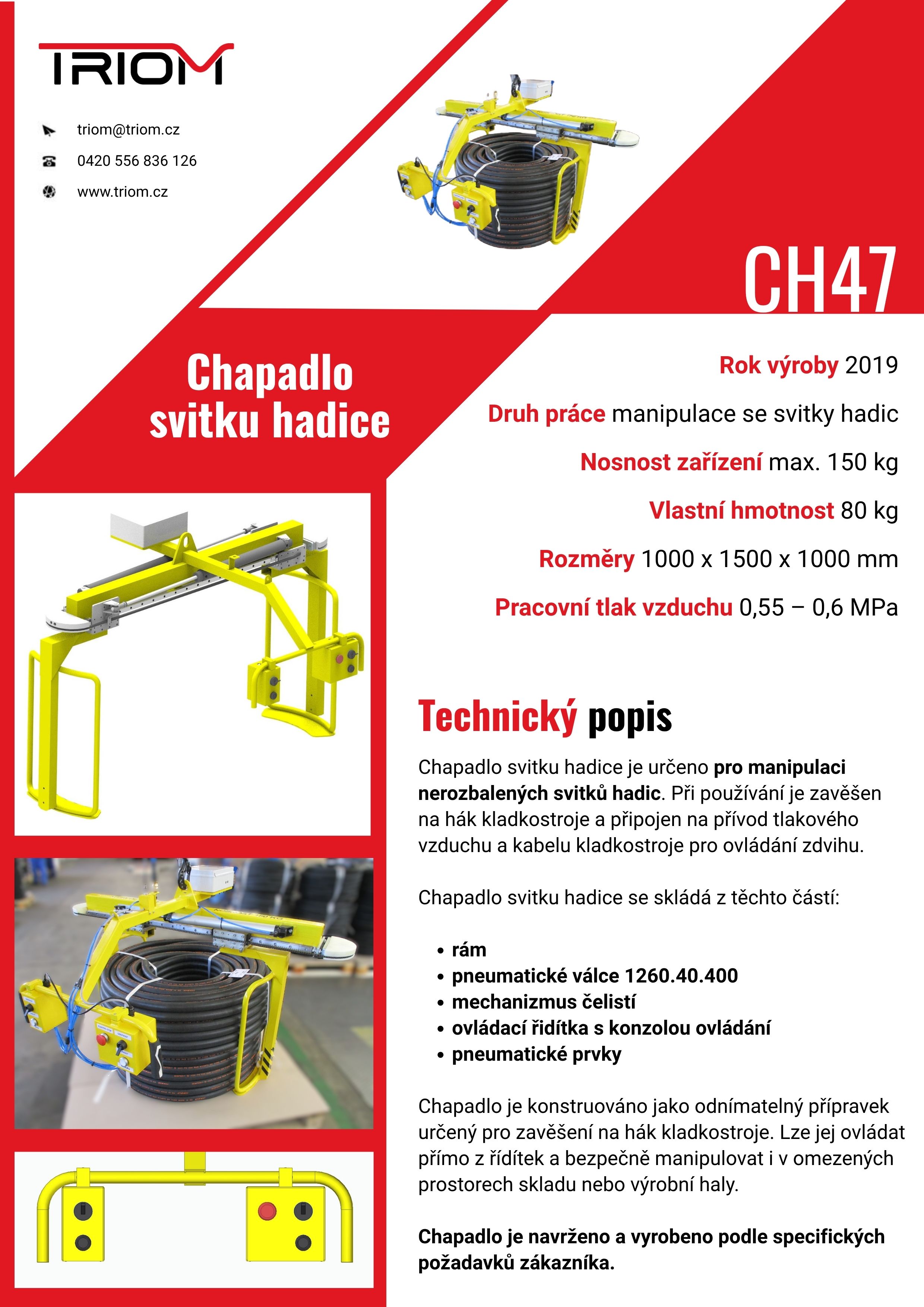 Chapadlo CH 47 zajišťuje stabilní uchopení svitků hadic z vnějšího průměru pomocí pneumatických čelistí. Umožňuje bezpečnou, rychlou a opakovatelnou manipulaci bez rizika poškození hadice nebo ohrožení obsluhy.